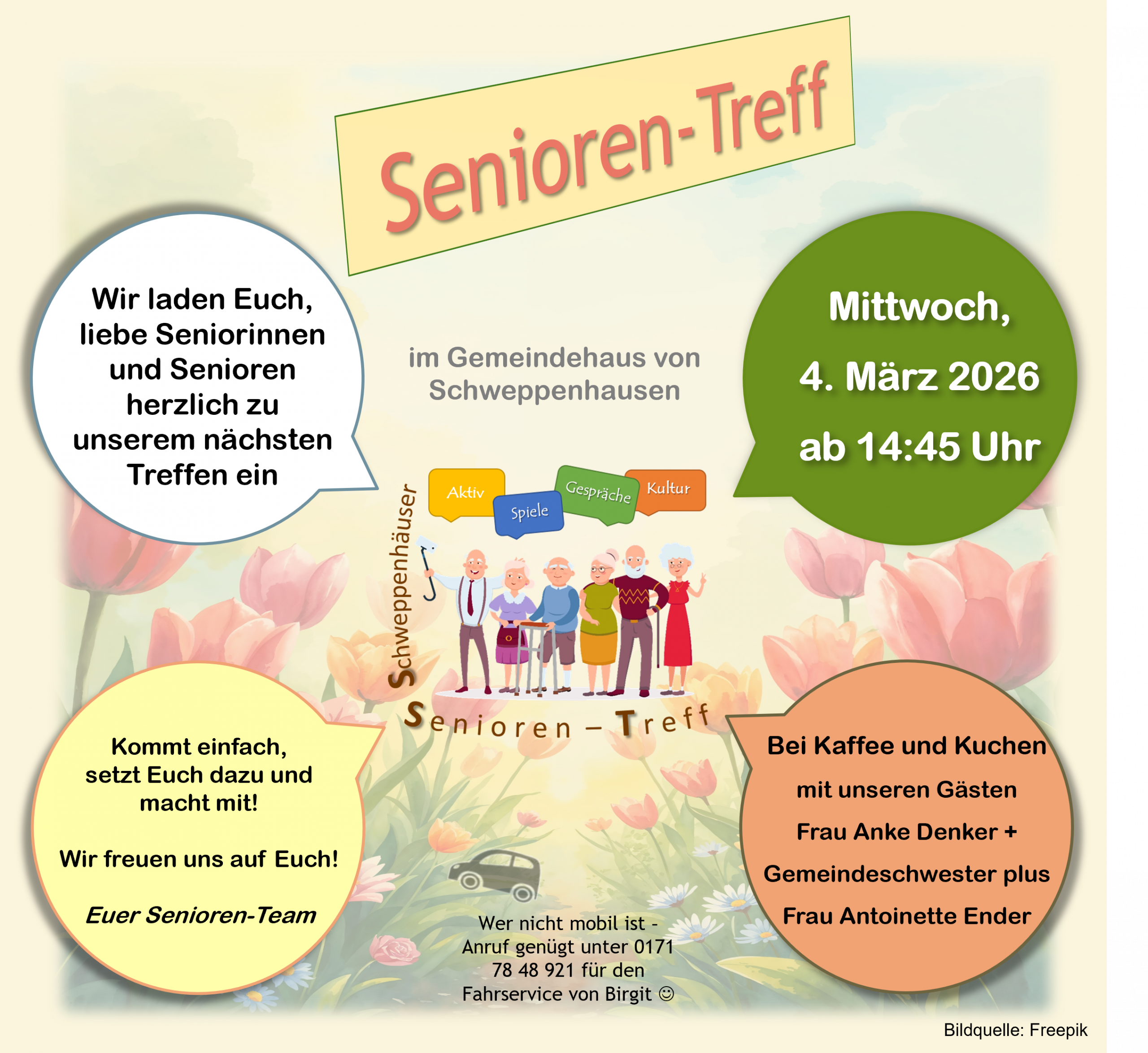 beim Seniorentreff am Mittwoch, den 4.03.2026 um 14:45 Uhr stellt sich die Gemeindeschwester plus des Landkreises Bad Kreuznach bei uns vor.